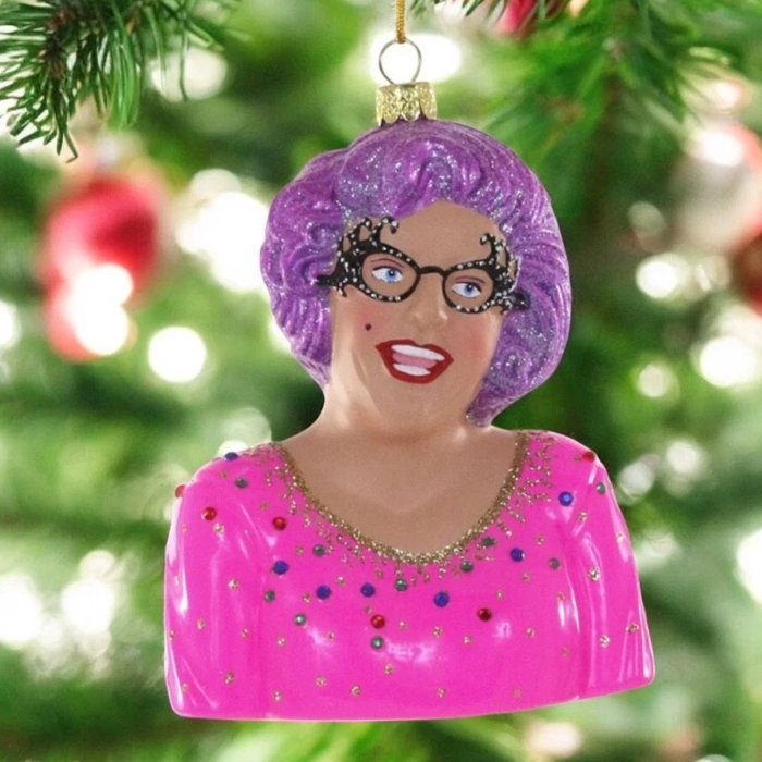 Make your tree sparkle with sass and sequins thanks to the Cody Foster Dame Edna Ornament! This fabulous tribute captures the iconic star’s signature purple hair, glittery glasses, and that unforgettable smile.