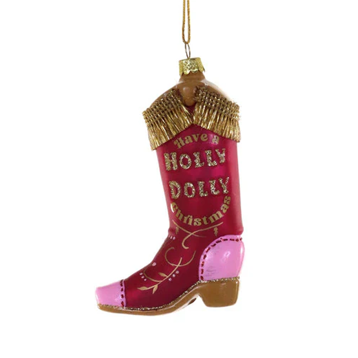 A glass rootin’ tootin’ Christmas tree decoration by Cod Foster, honouring the beloved Dolly Parton.