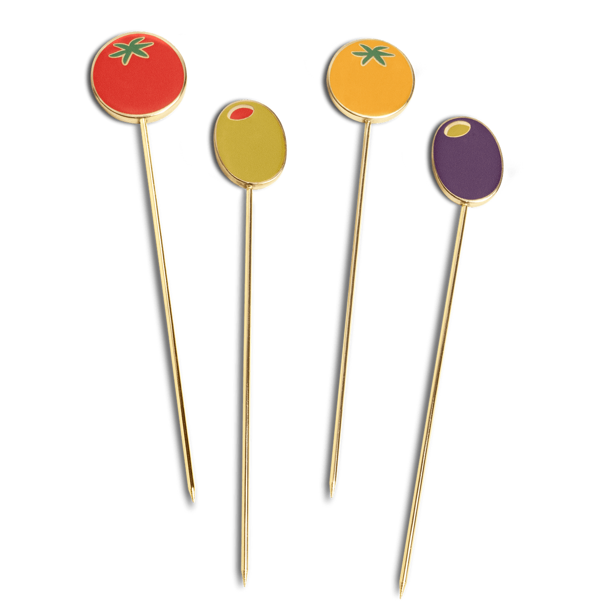 Set of four gold plated steel and enamel reusable cocktail & appetiser picks by Barcelona based design studio Octaevo.