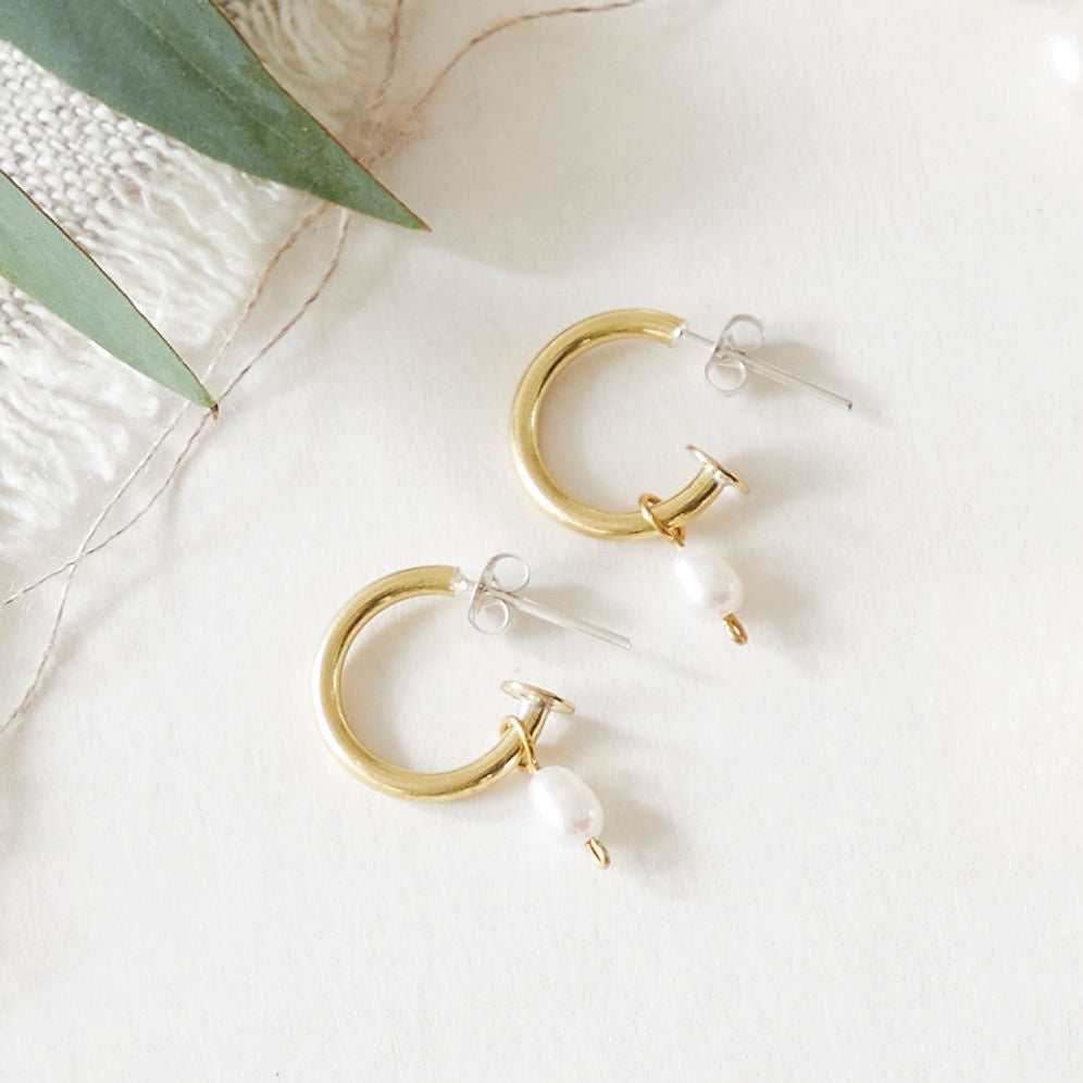 The pearls in this piece are carefully combined with hand cut textured strips of brass. Finished with gold plated earring hooks.