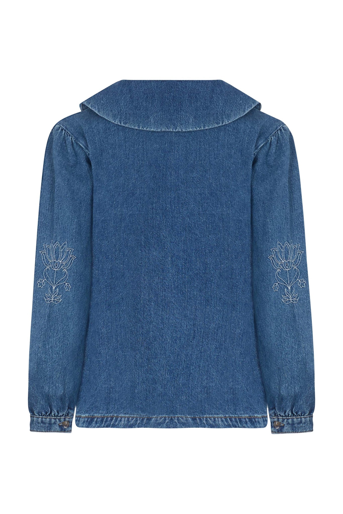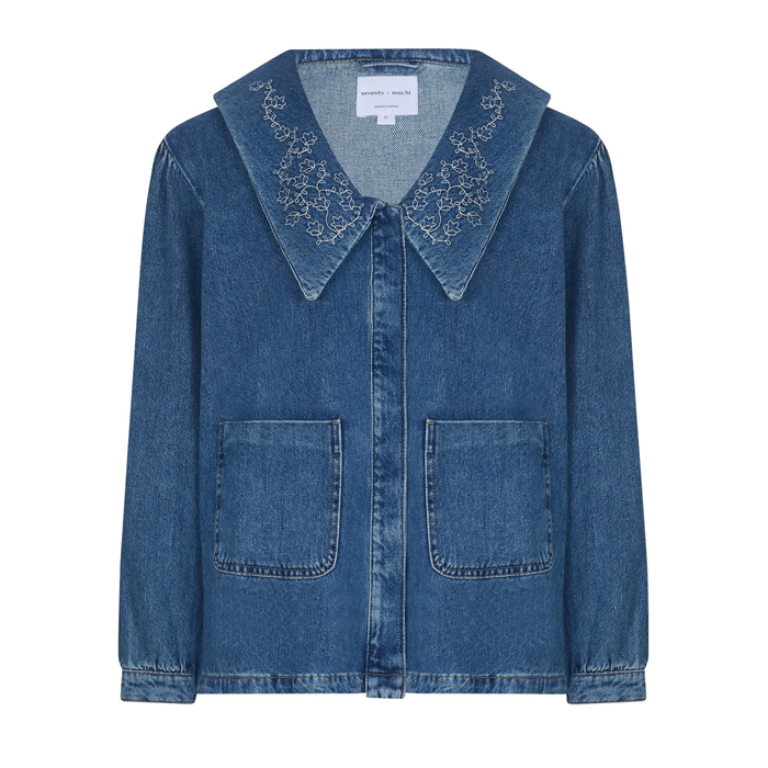 Oversized fit denim jacket with floral embroidery by Seventy & Mochi.