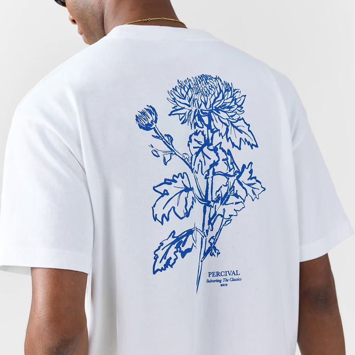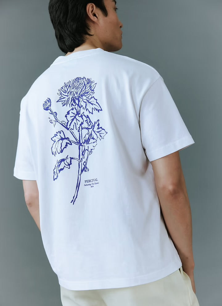 Oversized fit organic cotton t-shirt with small embroidered chest print & back ‘Flower ’ print by Percival.