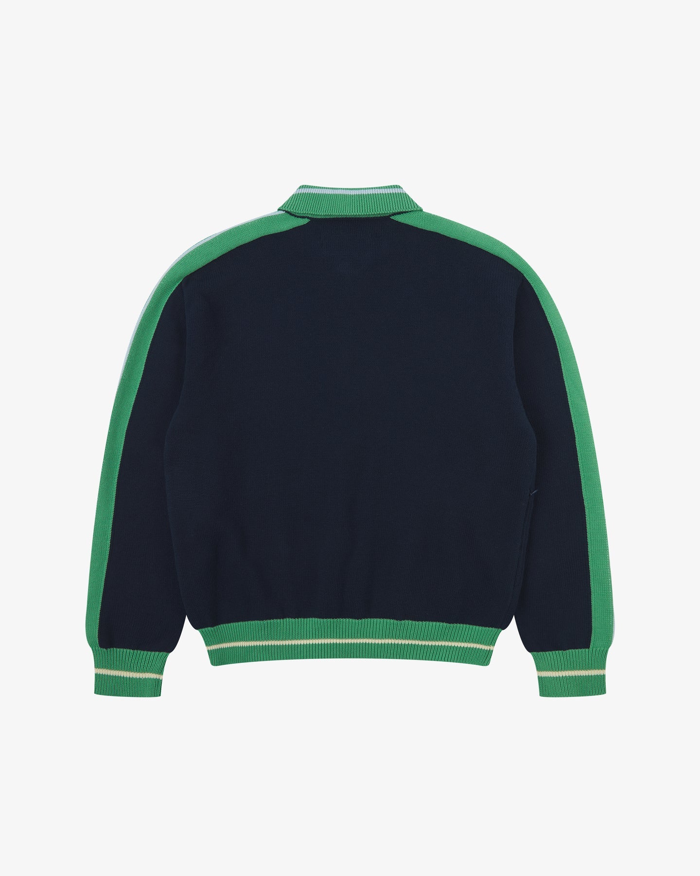 Contrasting thicky ribbed small collar, cuffs and hemline.