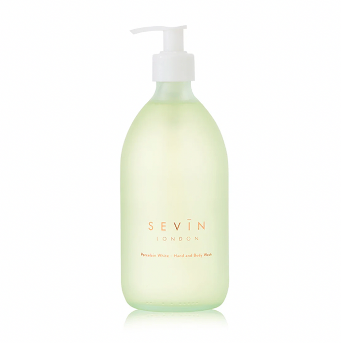 Sevin’s Porcelain White Hand & Body wash in a 300ml recyclable glass bottle.