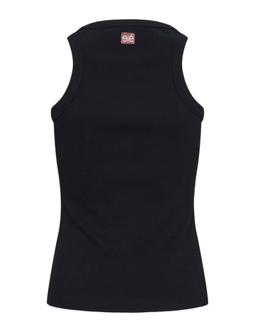 Racerback detail with woven logo at neck.